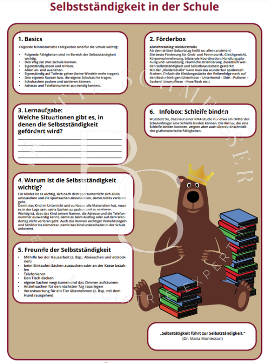 - Basics: Hier werden die einzelnen Kernkompetenzen für den Bereich Selbständigkeit in der Schule aufgezeigt, die elementar sind.